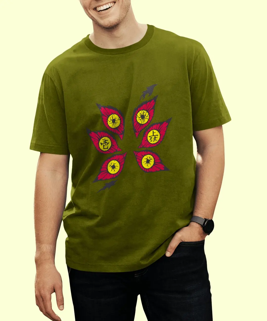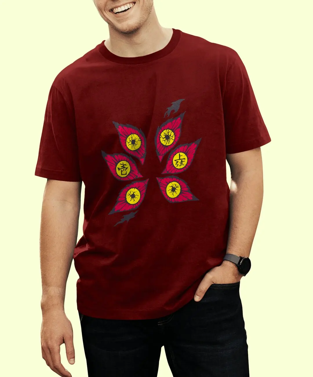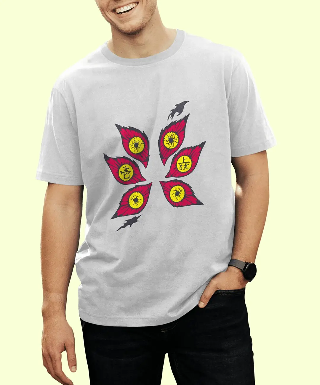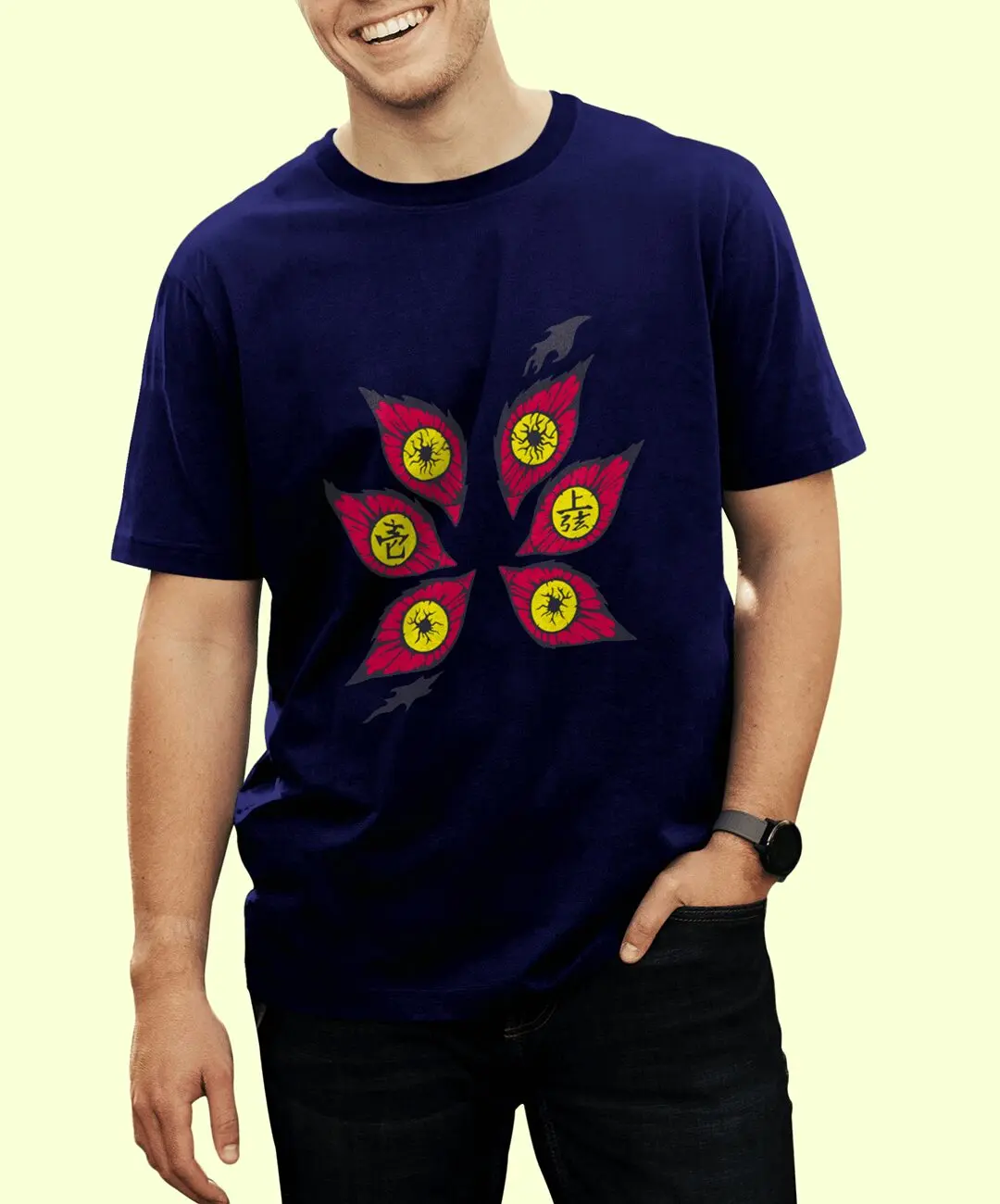 Kokushibo, once known as Michikatsu Tsugikuni, represents discipline taken to obsession. His iconic six eyes symbolize constant awareness, relentless judgment, and unmatched swordsmanship. This design translates that presence into a bold visual statement: six striking eyes arranged in a haunting formation, instantly recognizable to true Demon Slayer fans. It’s subtle enough to feel premium, yet powerful enough to command attention — the perfect balance for modern anime streetwear.
