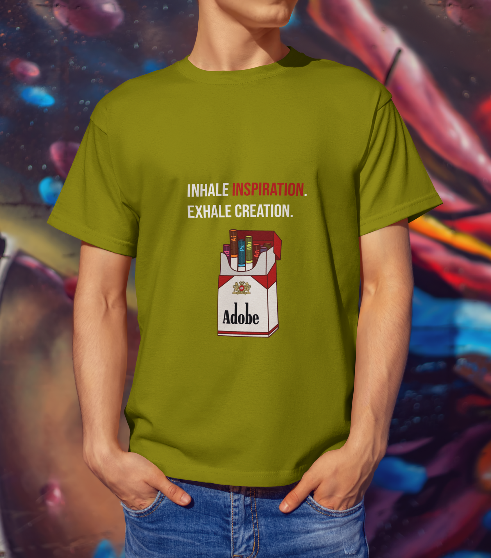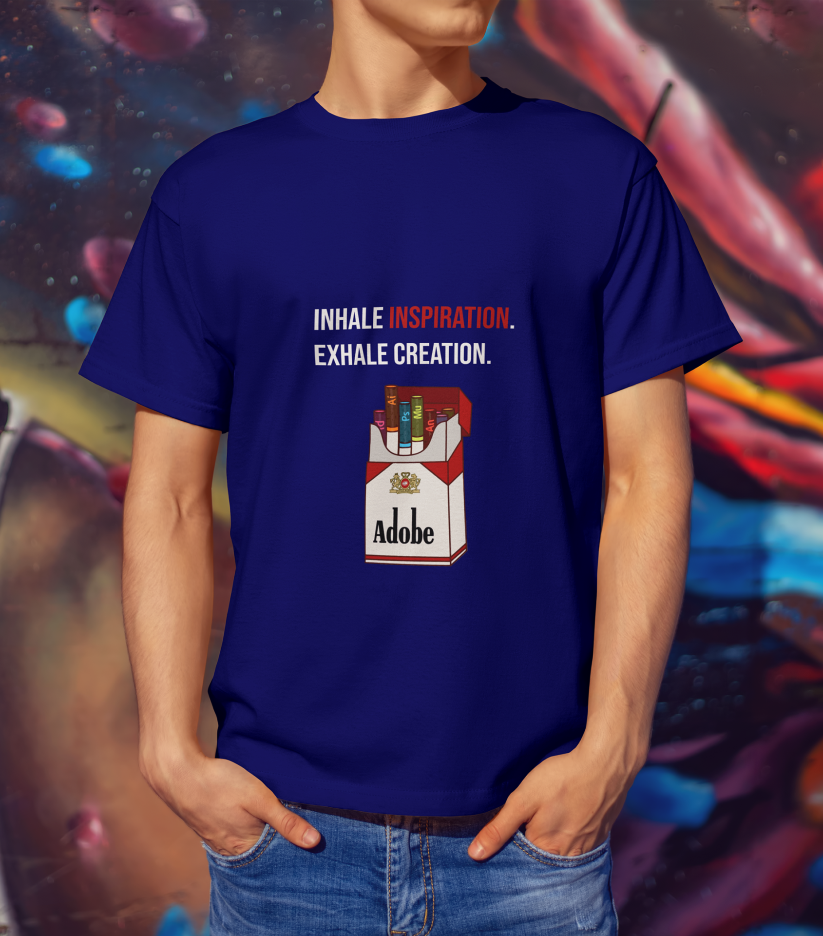 Premium Adobe Designer T-Shirt with “Inhale Inspiration, Exhale Creation” design. 100% cotton, 180 GSM regular fit with premium DTF printing for lasting durability. Perfect for creative professionals, graphic designers, and Adobe enthusiasts. Unique conversation starter that celebrates the creative lifestyle with humor and style.