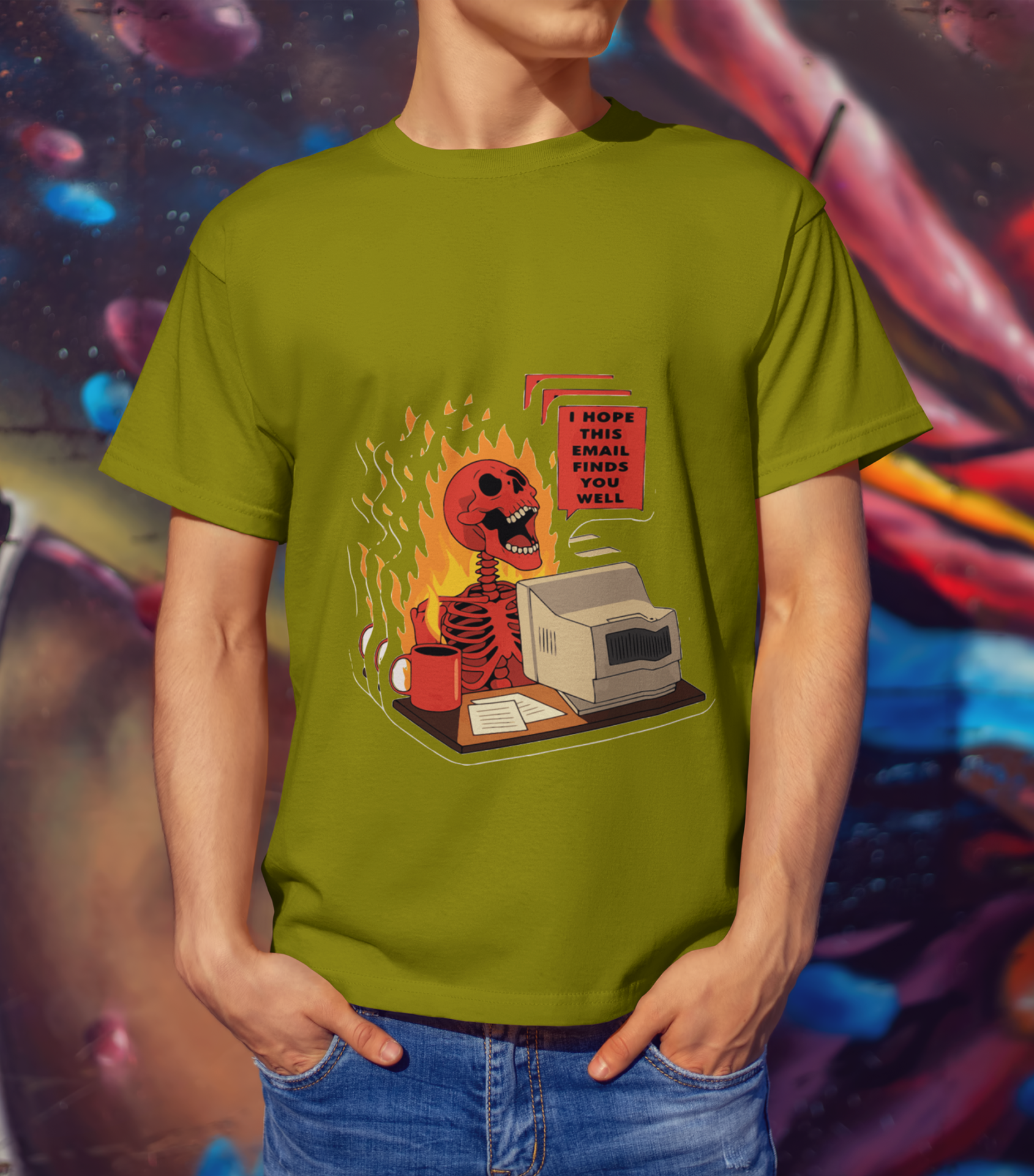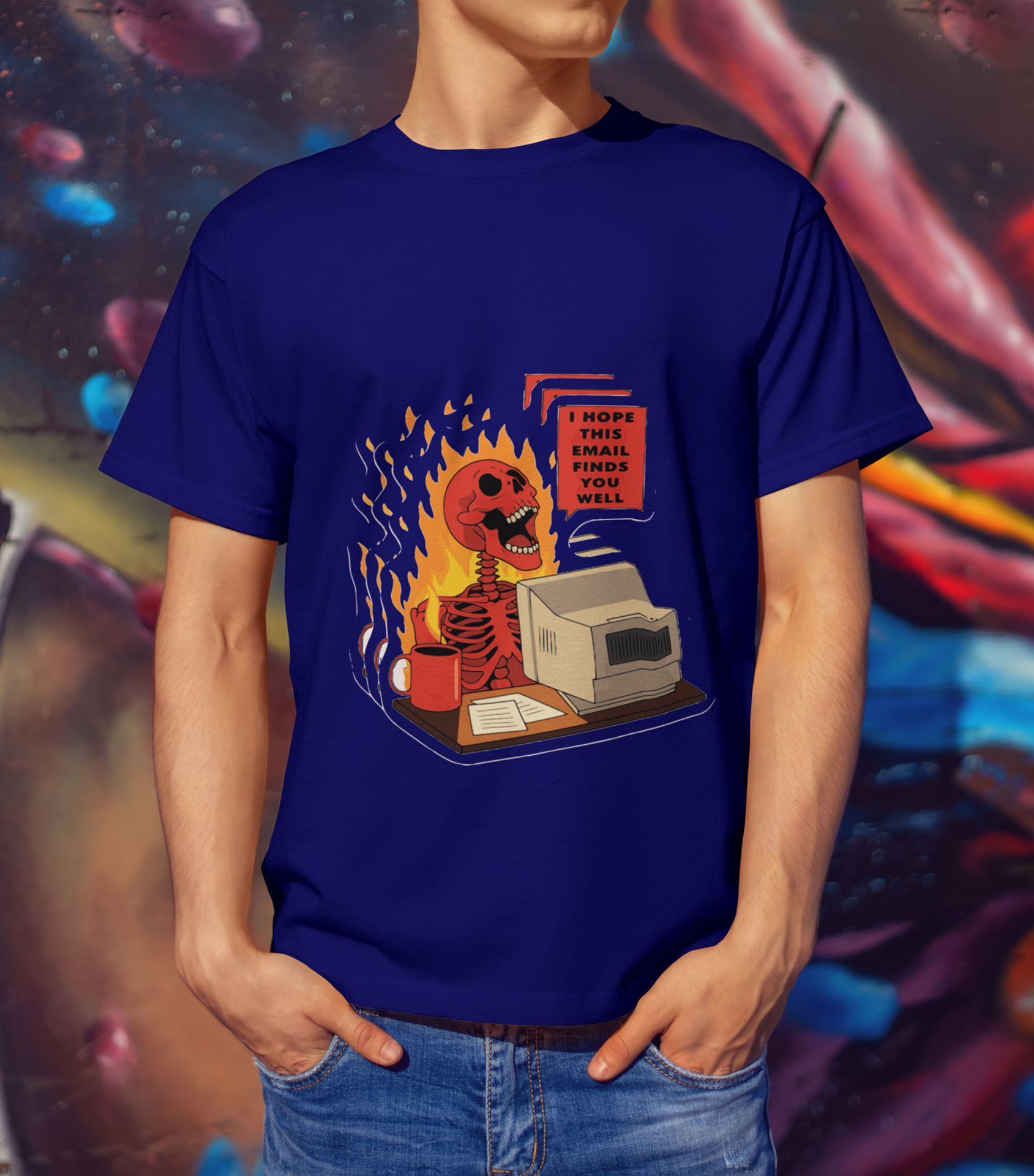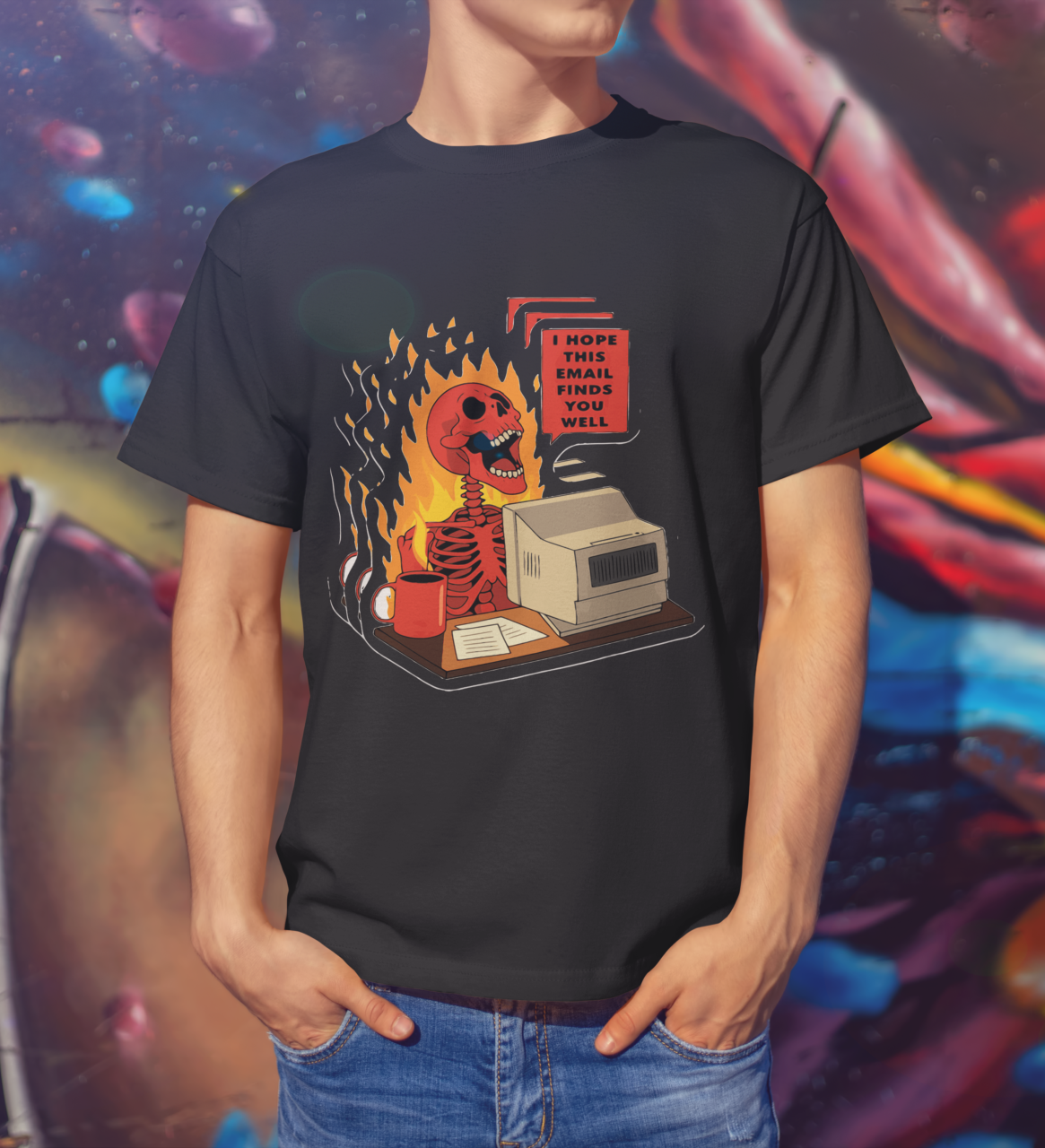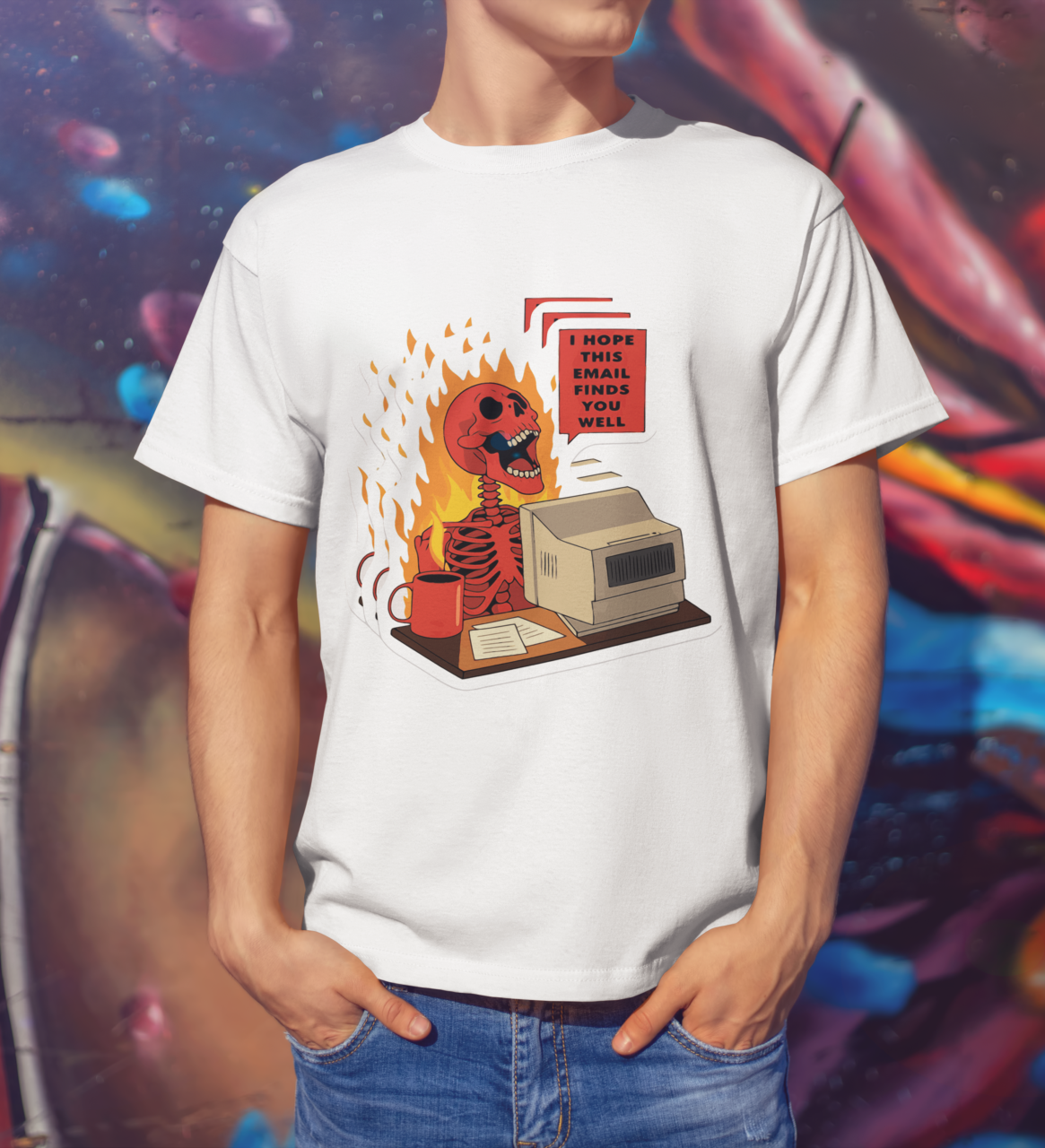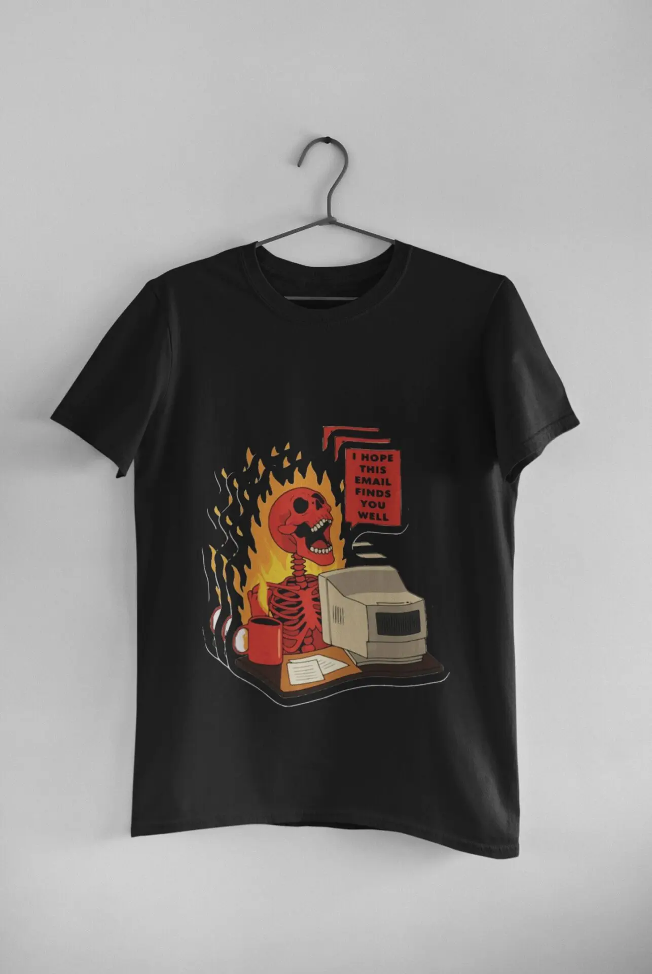 This design taps into the universal experience of corporate communication fatigue that has made skeleton email memes a social media sensation. The skeleton sitting at a computer with the phrase “I Hope This Email Finds You Well” has become the unofficial mascot of remote work culture, making this shirt an instant hit with colleagues, friends, and fellow email warriors.