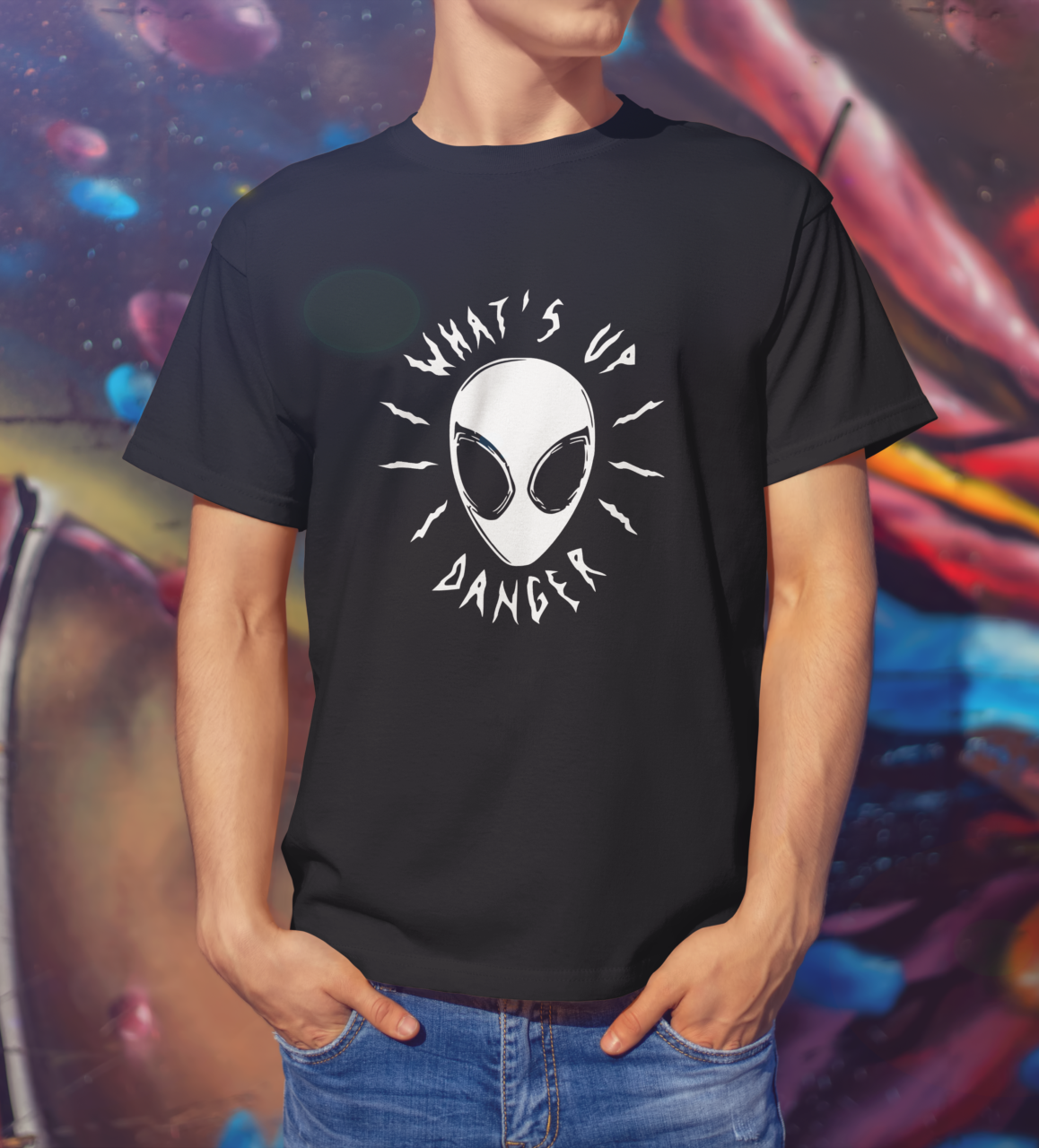 The striking alien-inspired graphic design features a mesmerizing extraterrestrial head surrounded by radiating energy lines, perfectly complementing the bold “What’s Up Danger” slogan. This creative fusion of Spider-Verse culture and cosmic mystery creates a conversation-starting design that appeals to Marvel fans, sci-fi enthusiasts, and streetwear aficionados alike.