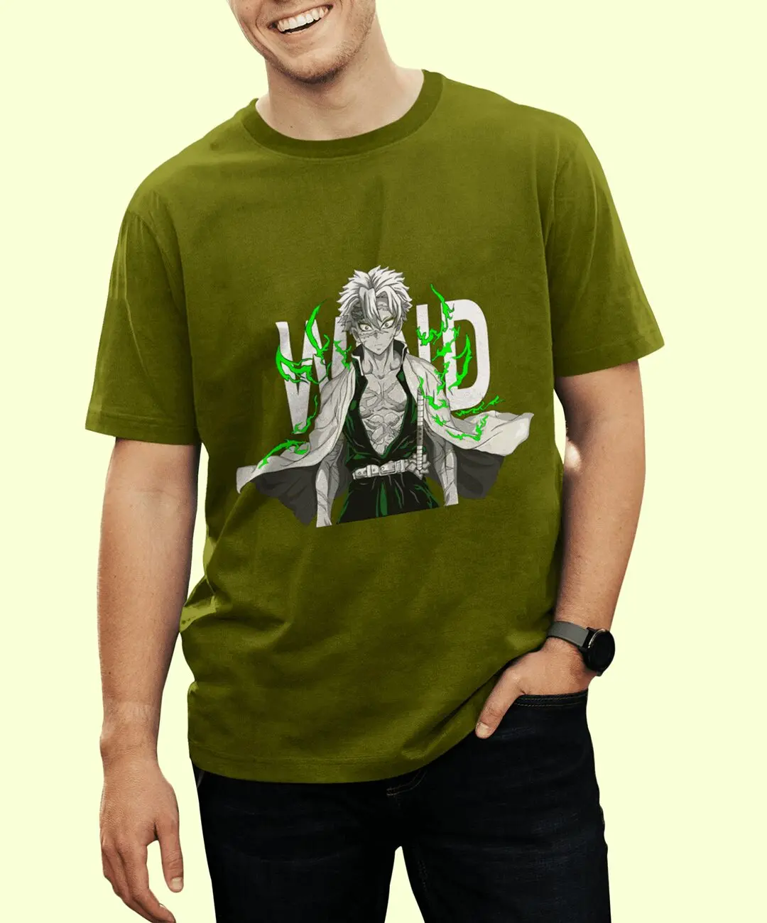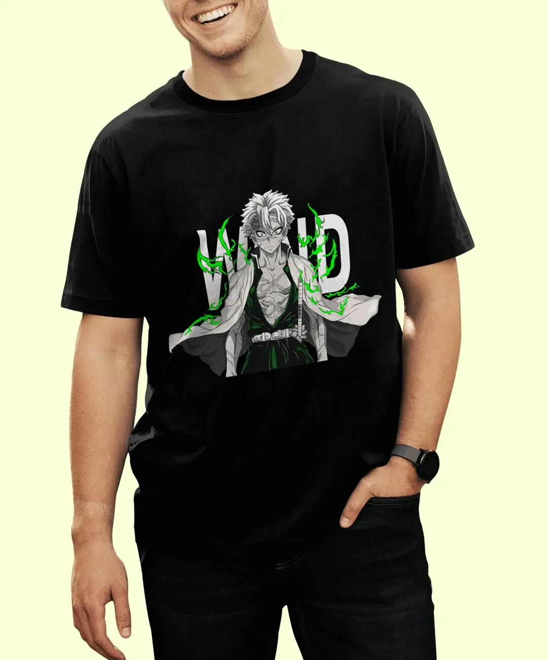 The artwork focuses on Sanemi’s piercing gaze, defined musculature, and flowing haori, surrounded by vivid green wind-like energy that symbolizes the destructive force of Wind Breathing. The composition feels alive — as if the character is stepping out of the battlefield — making this tee a true statement piece for Demon Slayer fans.